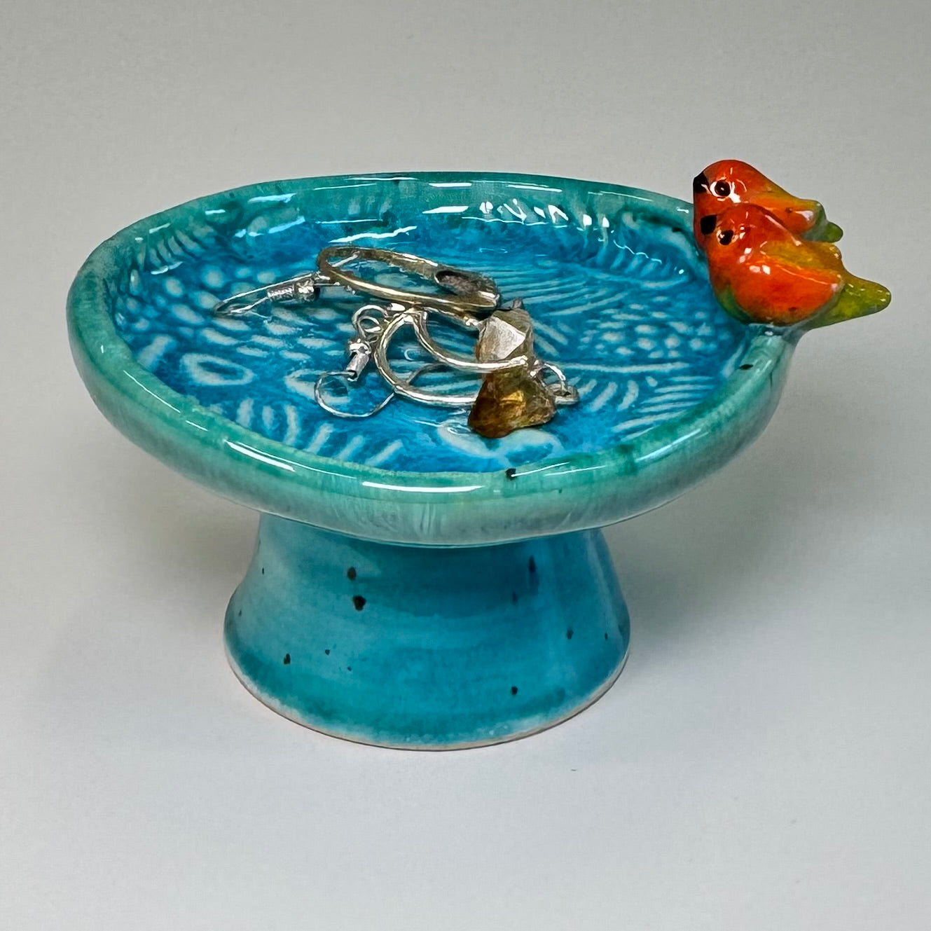 This beautiful piece was wheel thrown in 2 separate pieces then added cute sculpted and hand painted birds at the edge to resemble a miniature birdbath. This is a great and useful piece to keep your jewelry so they never get misplaced or lost.