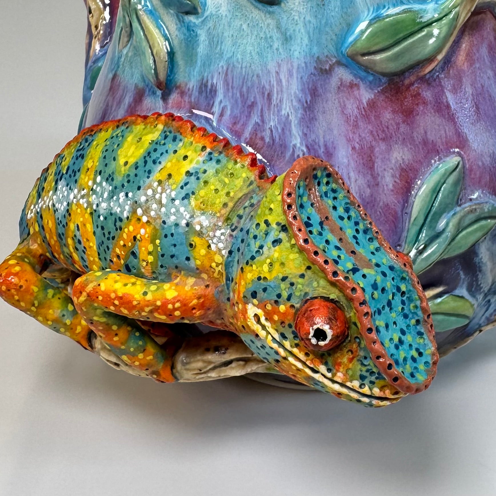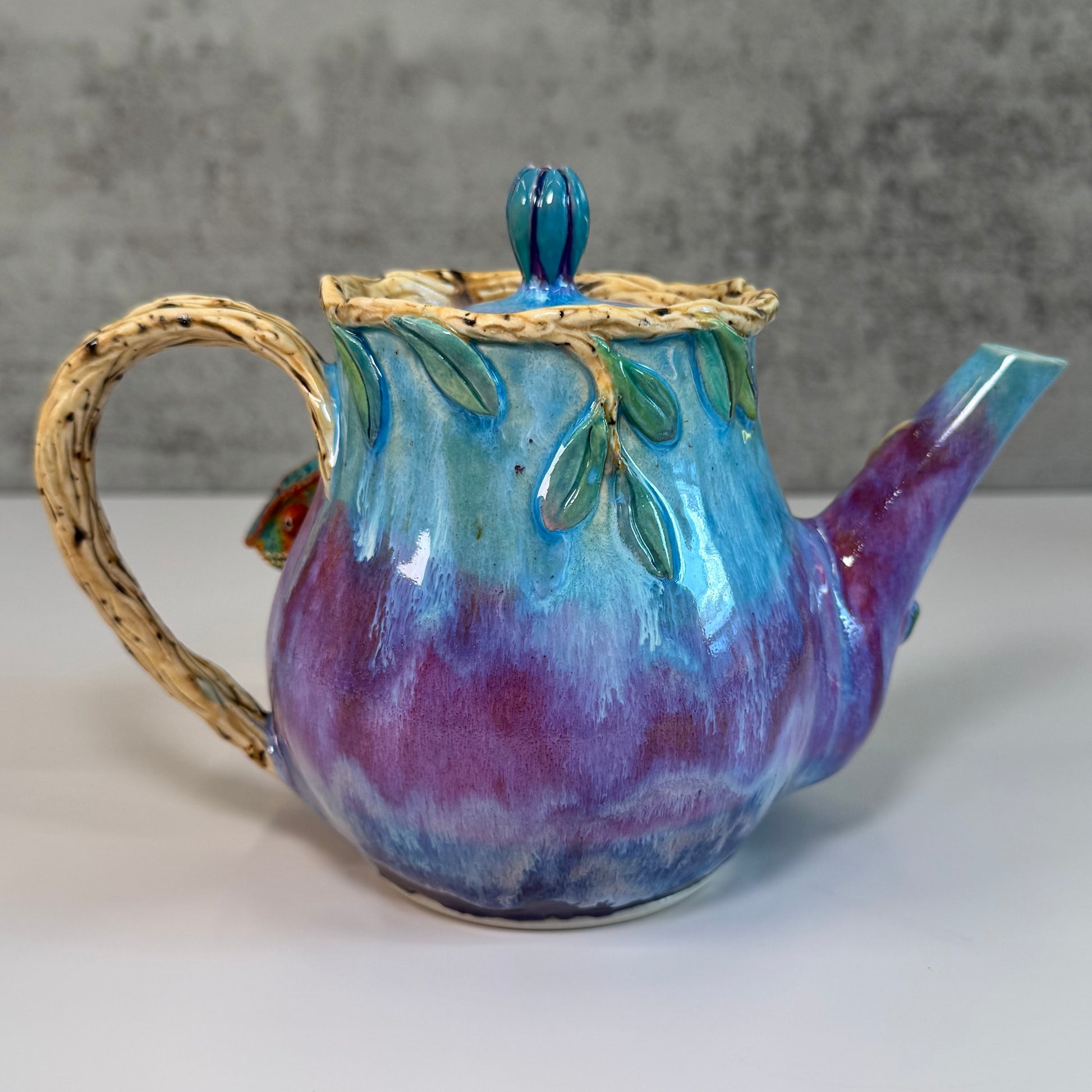 Beautiful wheel thrown teapot in white stoneware. Every detail was hand sculpted and hand painted from the colorful chameleon to the branches and leaves. The background glazes are glossy turquoise, lilac and dark purple. Inside it is glossy turquoise and it has a built in strainer for loose tea. It is food safe and microwave safe and I recommend hand washing because of the fragile details.