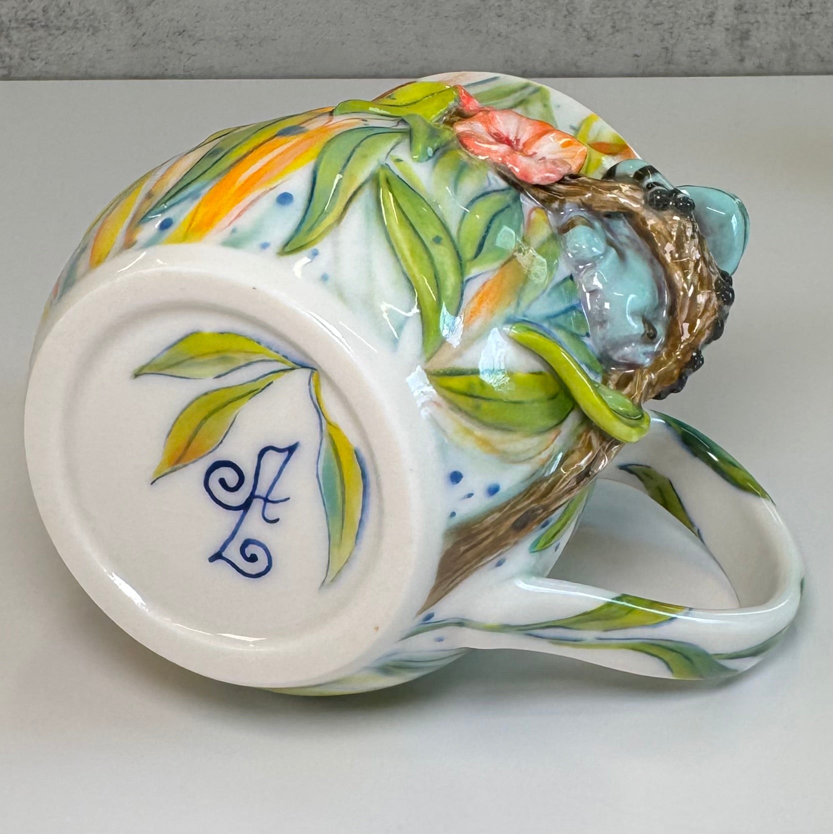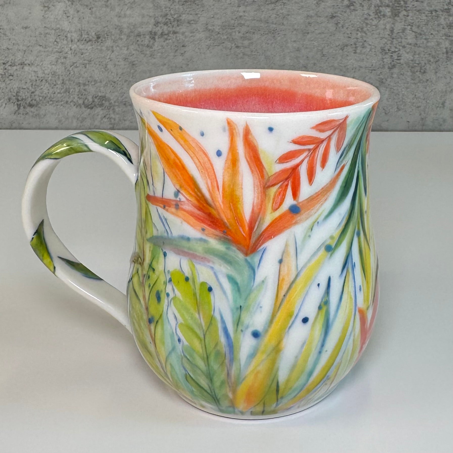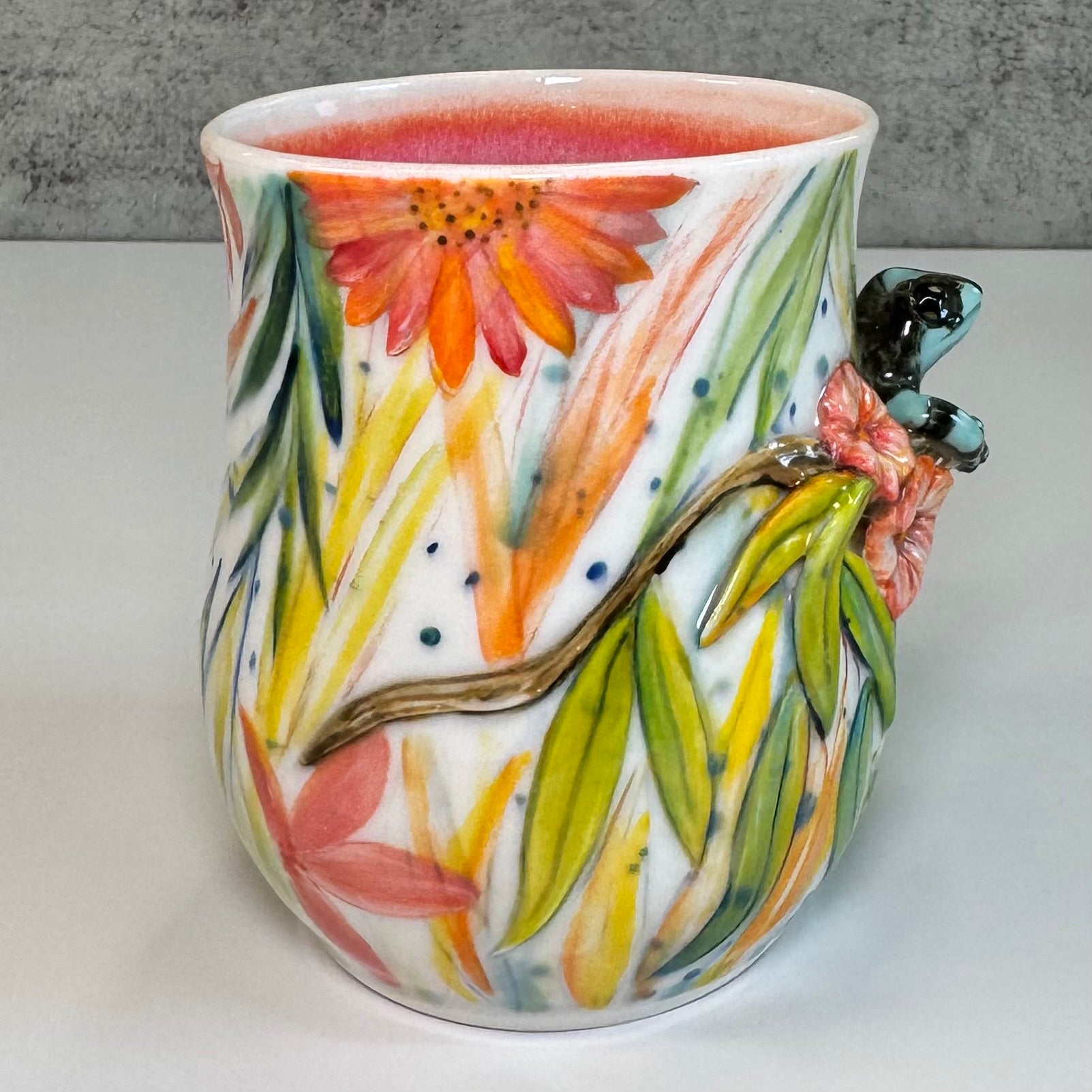 This fantastic tropical frog mug was hand sculpted and hand painted using underglazes all around. The glaze inside is glossy pink and outside is glossy clear.