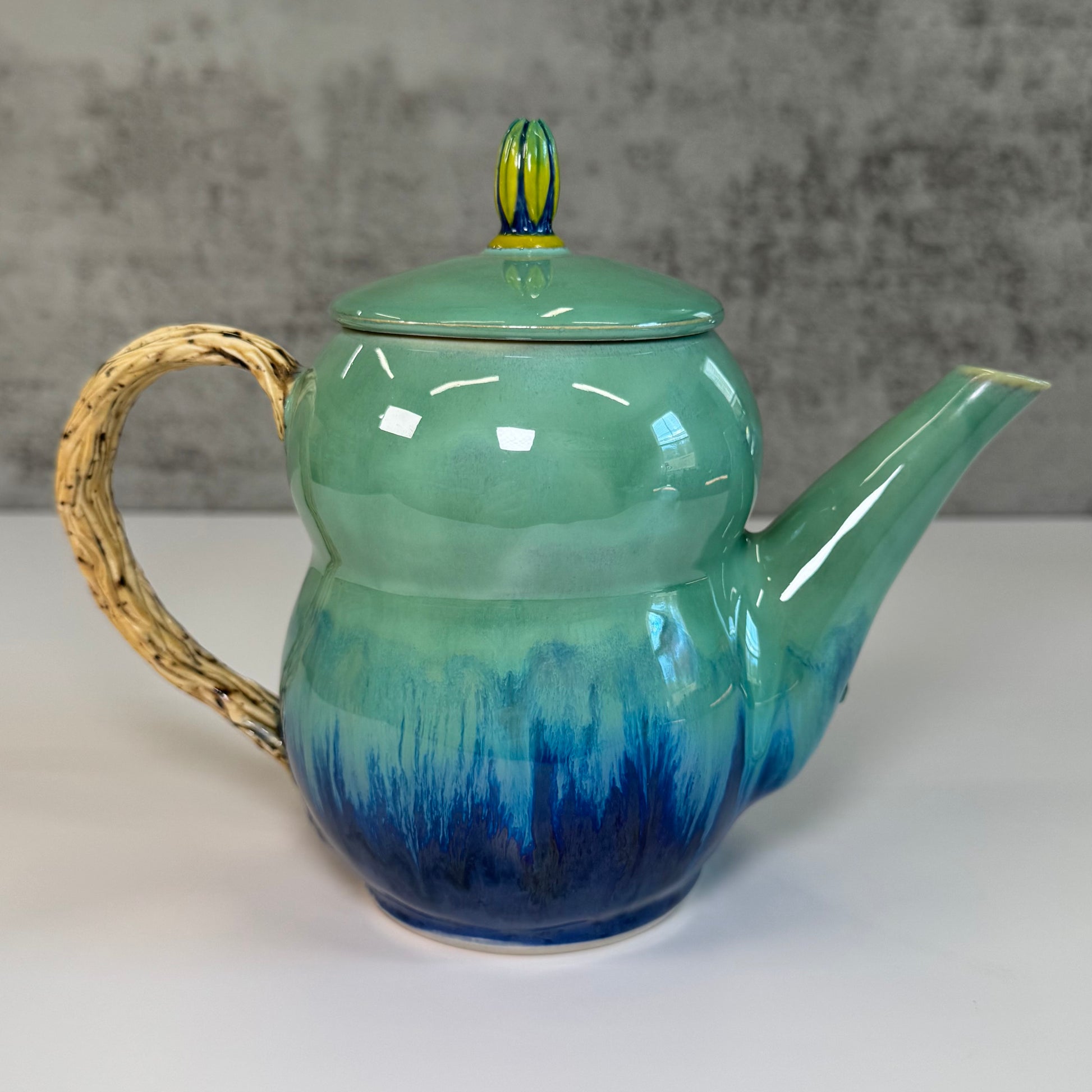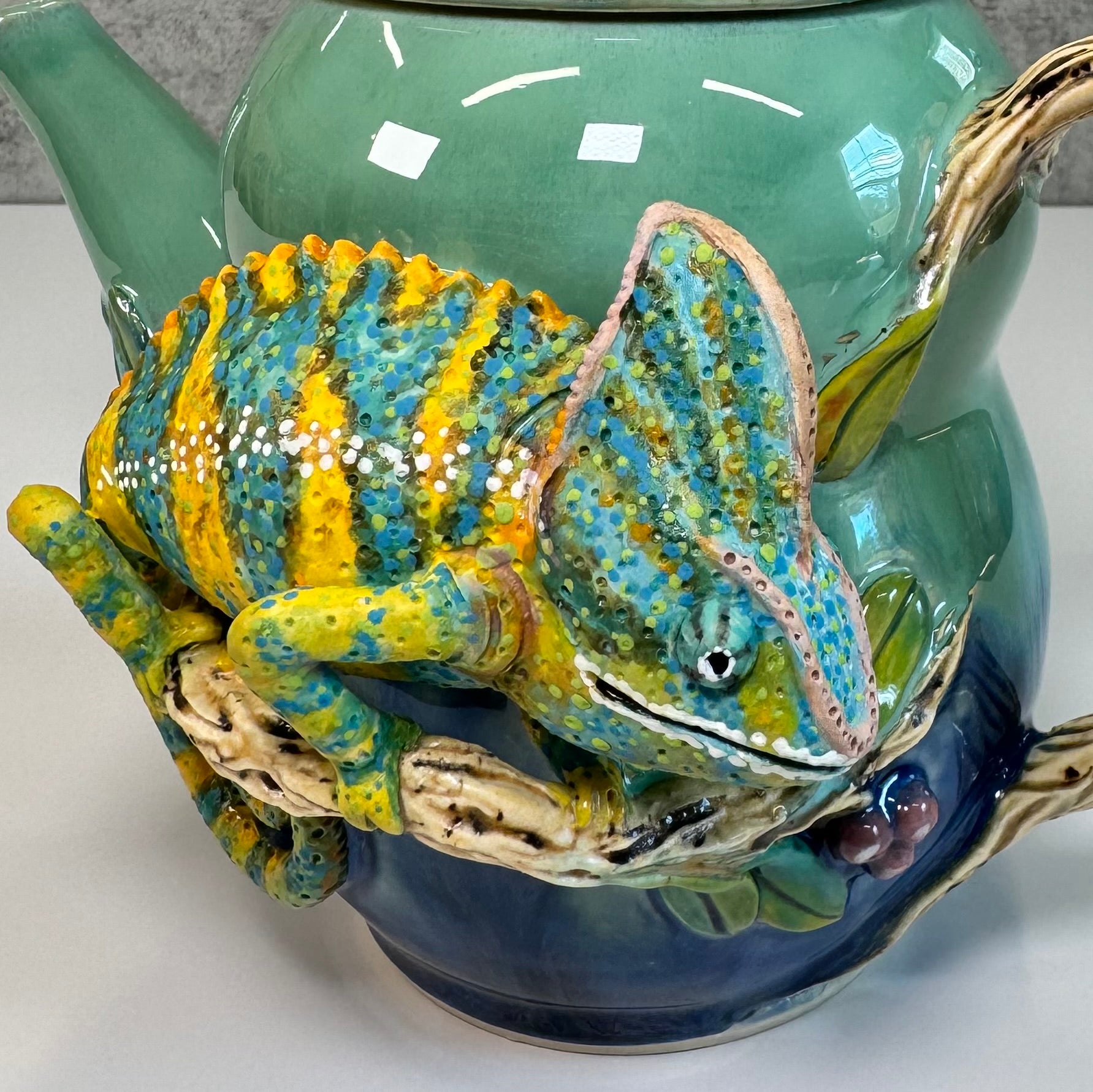 Beautiful wheel thrown teapot in white stoneware. Every detail was hand sculpted and hand painted from the colorful chameleon to the branches and leaves. The background glazes are glossy green/teal and dark blue. Inside it is glossy turquoise and it has a built in strainer for loose tea. It is food safe and microwave safe and I recommend hand washing because of the fragile details.